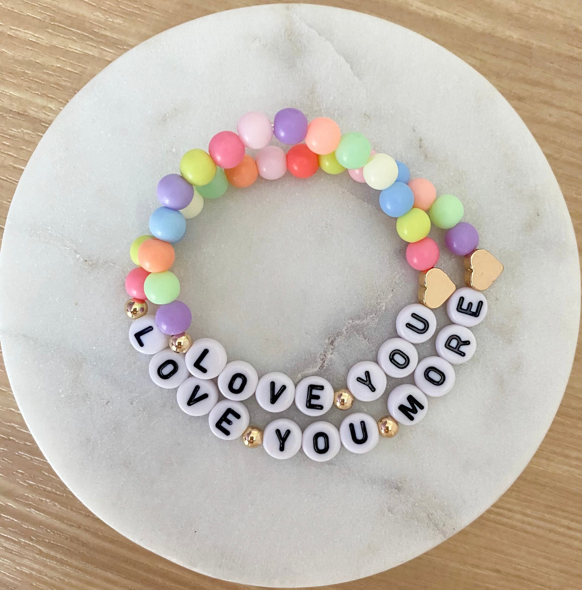 The Love You, Love You More- Mama and Mini bracelet set is such a sweet way to feel connected to your little one! The bracelets are designed with acrylic beads, gold plated beads, and gold filled beads, strung on an elastic cord.