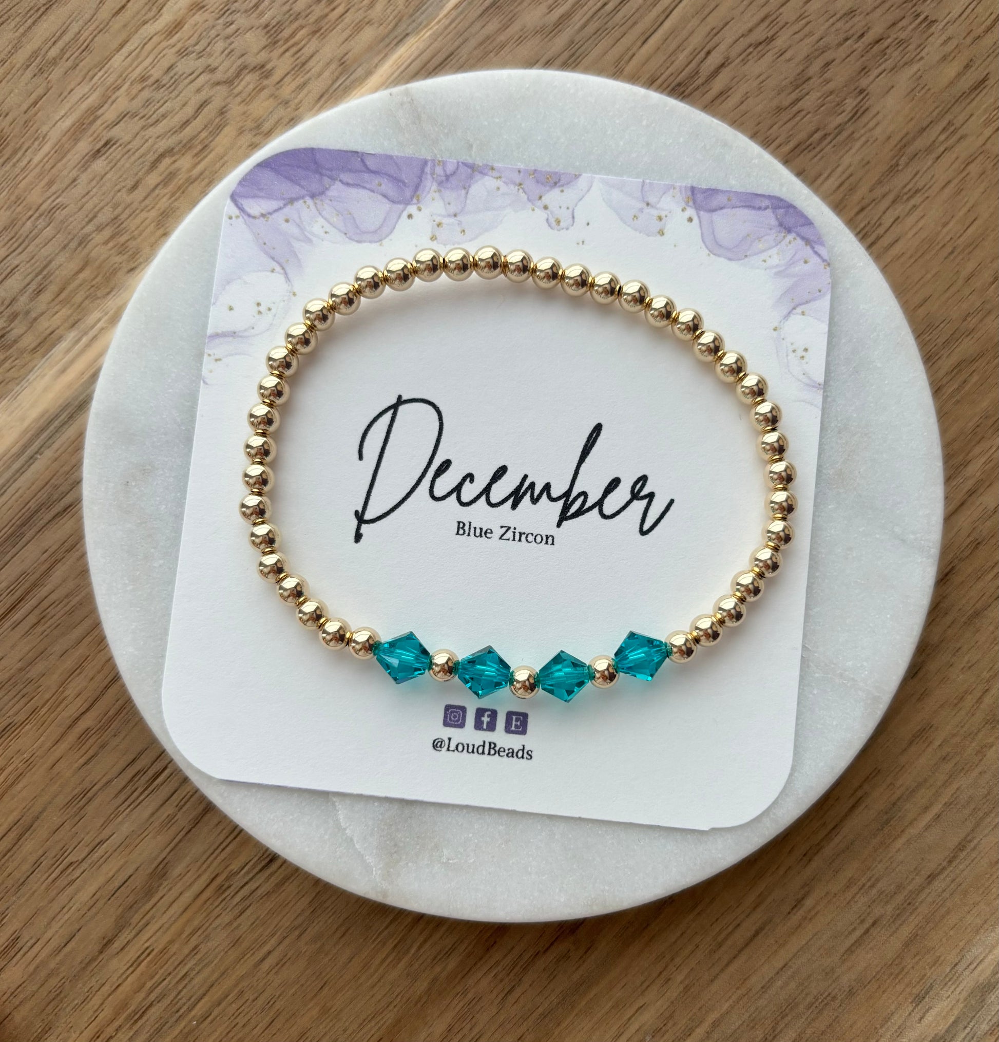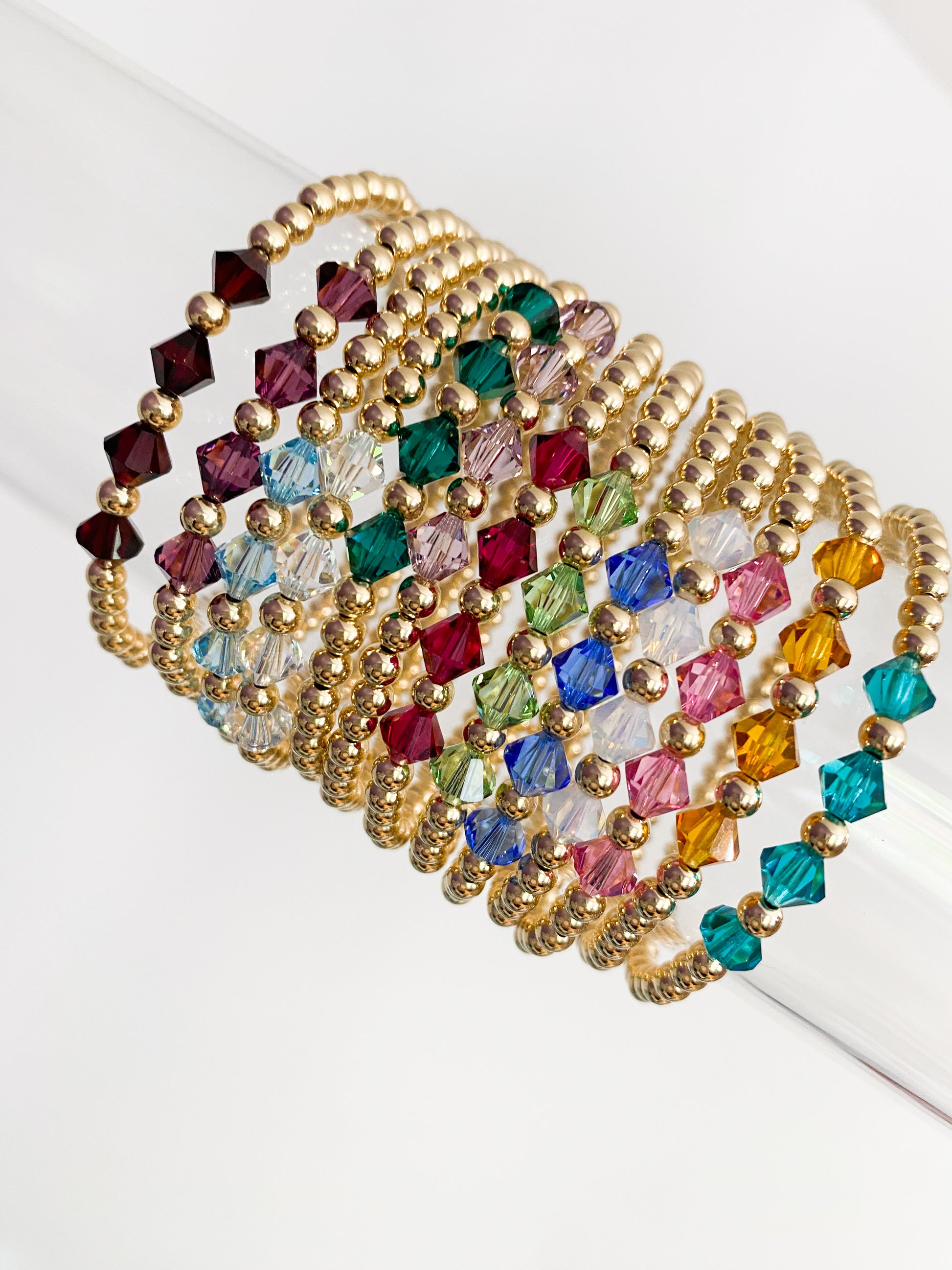 Birthstone bracelets are such meaningful pieces. Wear your birthstone or a loved one's birthstone. These bracelets are designed with Swarovski crystals and 14kt gold filled (tarnish resistant) beads strung on an elastic cord.